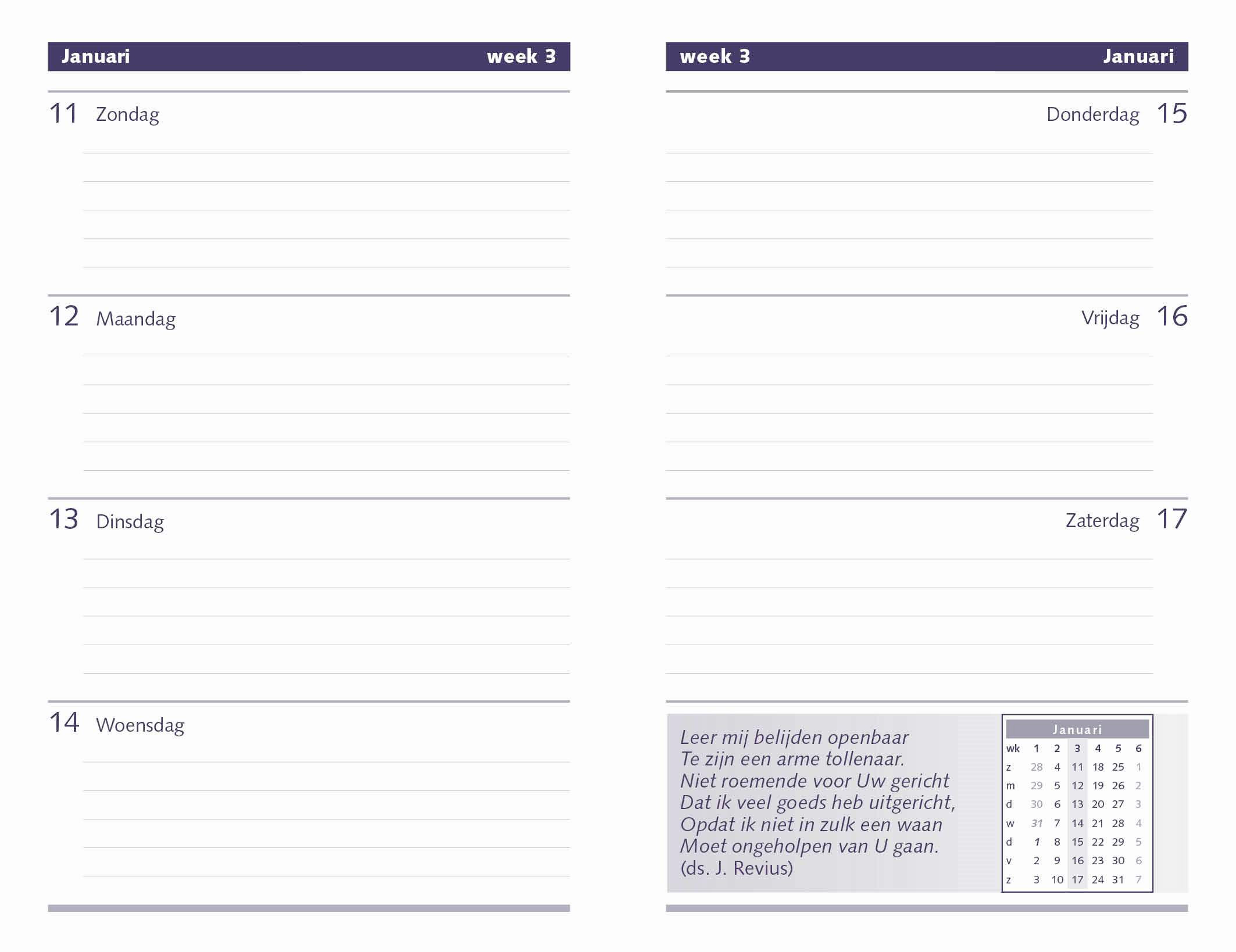 In deze mooie en handige zakagenda (9 bij 14 cm) begint iedere week met de zondag! Verder is voor iedere week een spreuk of inhoudsvol gedicht opgenomen. Elke week omvat twee pagina’s, zodat er voldoende ruimte is om te schrijven. Ook zijn er speciale pagina’s opgenomen voor het noteren van uw eigen gegevens en telefoonnummers alsmede voor het maken van notities. De zakagenda is voorzien van een harde kaft
