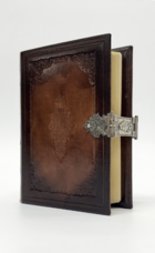 Antiekgebonden micro zakbijbel met blindstempel in lederen band met zilveren slot.