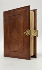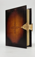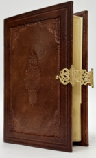 Antiekgebonden leren zakbijbel (8,5 x 12,5 cm.) met blindstempel en gouden slot.
