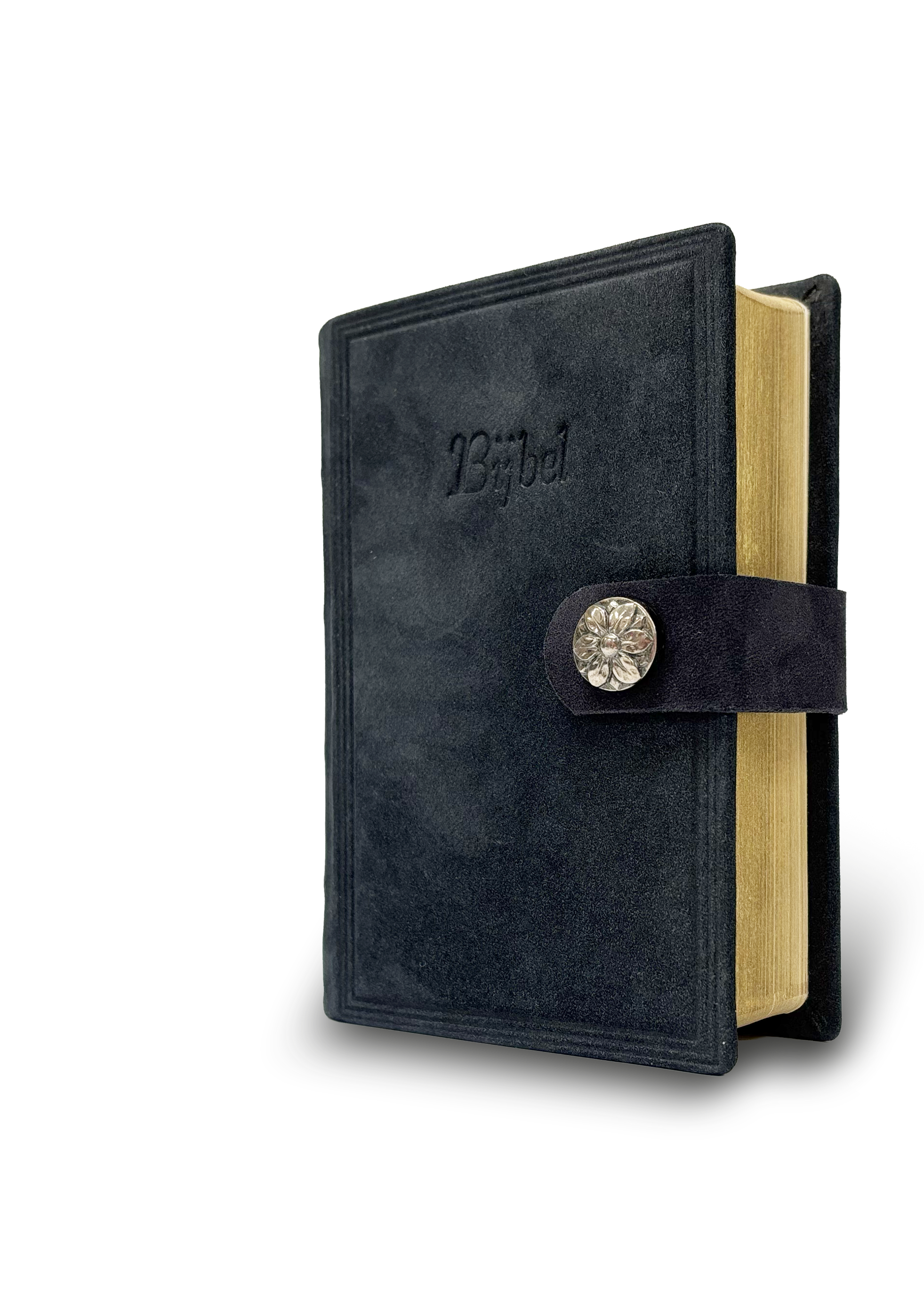De band van deze Bijbel in nubuckleer, is gemaakt van de beste Europese runderhuiden. Door de speciale bewerking ontstaat een fluweelzachte uitstraling met een aangenaam vleugeleffect. De omslag is bruin en heeft een drukknoop met een afbeelding van een bloem.