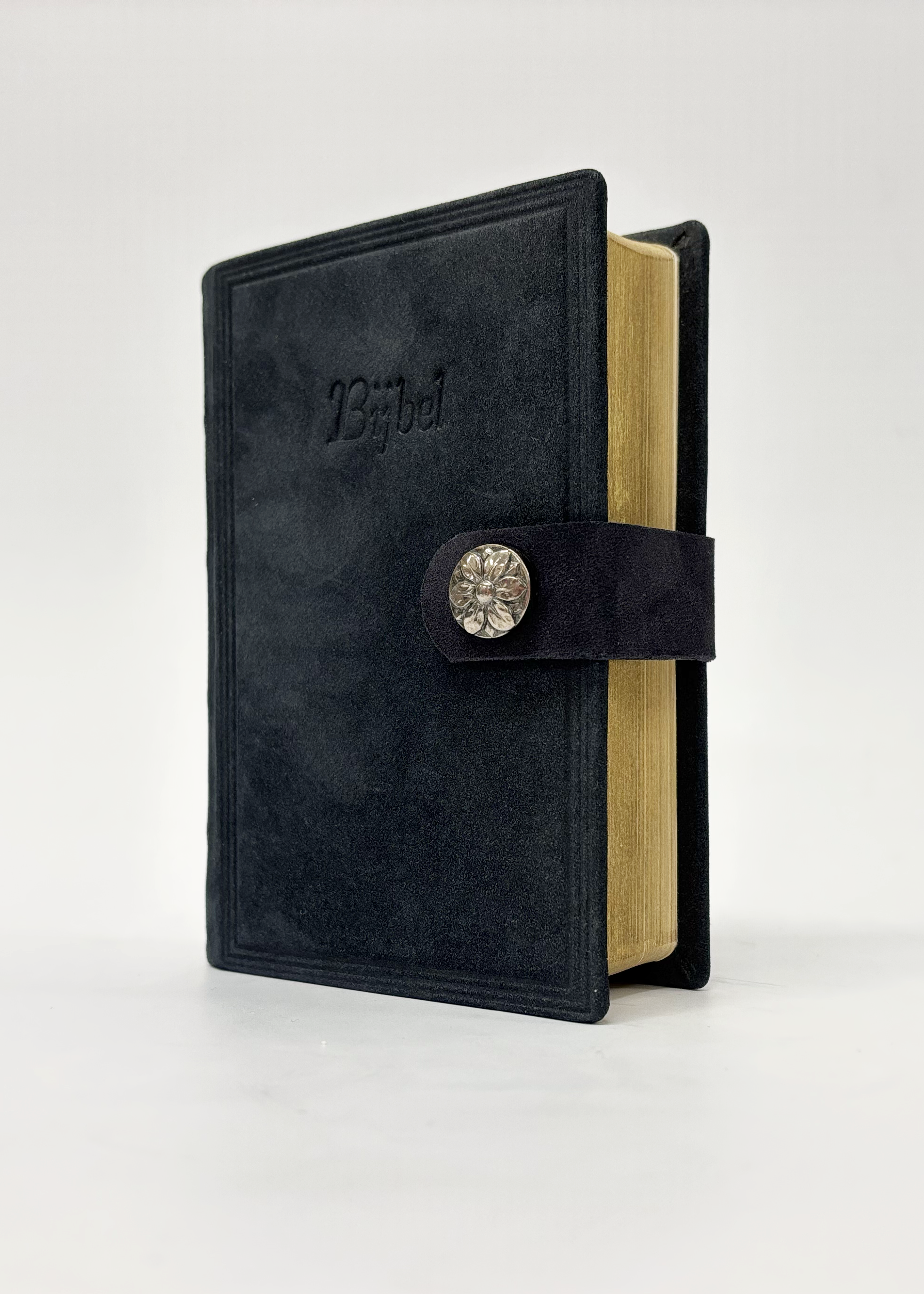 De band van deze Bijbel in nubuckleer, is gemaakt van de beste Europese runderhuiden. Door de speciale bewerking ontstaat een fluweelzachte uitstraling met een aangenaam vleugeleffect. De omslag is bruin en heeft een drukknoop met een afbeelding van een bloem.
