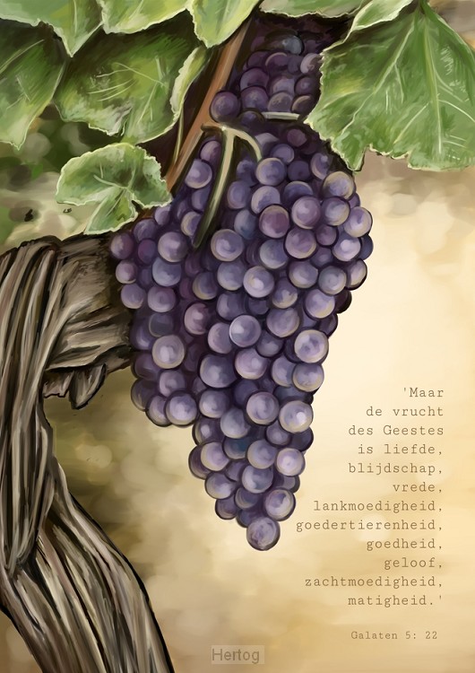 'Maar de vrucht des Geestes is liefde, blijdschap, vrede,lankmoedigheid, goedertierenheid, goedheid, geloof, zachtmoedigheid, matigheid.'