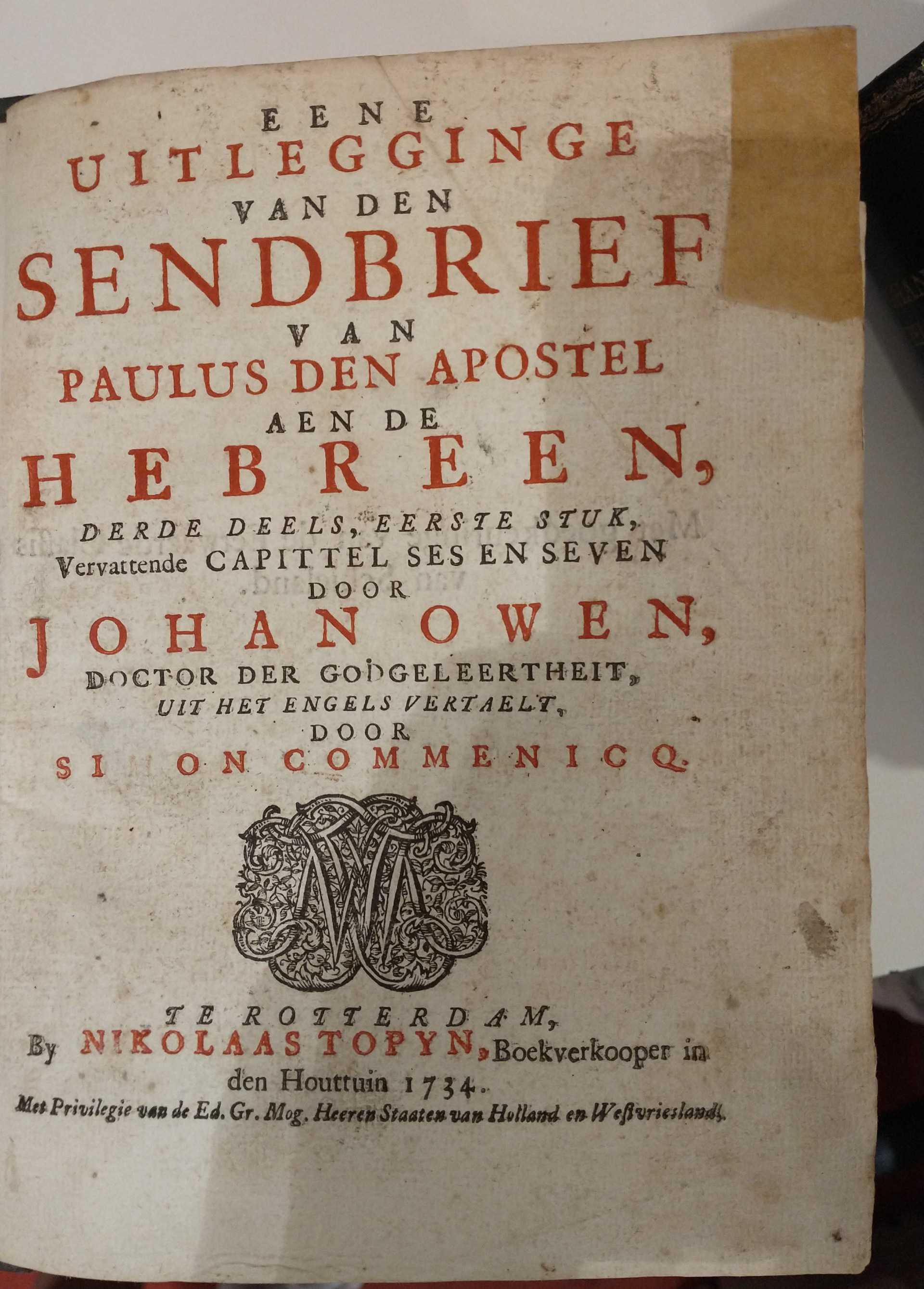 Eene uitlegginge van den sendbrief van den Paulus den apostel aen de Hebreeën. Derde deels, eerste stuk, vervattende capittel ses en seven door Johan Owen, doctor der Godgeleertheit. Uit het engels vertaald door Si on Commenicq.